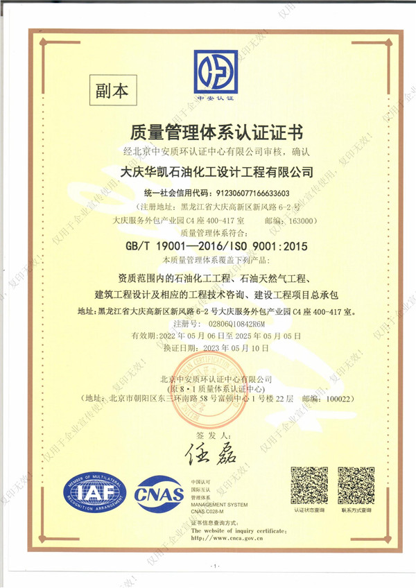 近日,我司順利通過(guò)質(zhì)量管理體系認證,這標志著(zhù)華凱公司在項目質(zhì)量體系建設上已經(jīng)達到了相關(guān)標準。質(zhì)量管理體系認證證書(shū)的取得同時(shí)也是公司各項管理工作的規范化、標準化的體現,是對公司持續穩定健康發(fā)展的重要保證。我們將進(jìn)一步優(yōu)化和規范各項管理制度,不斷提高體系運行的有效性,不斷提高公司的管理水平,共同推進(jìn)公司的快速發(fā)展。自此,華凱公司質(zhì)量管理體系的標準化、規范化及科學(xué)化又邁上新臺階。